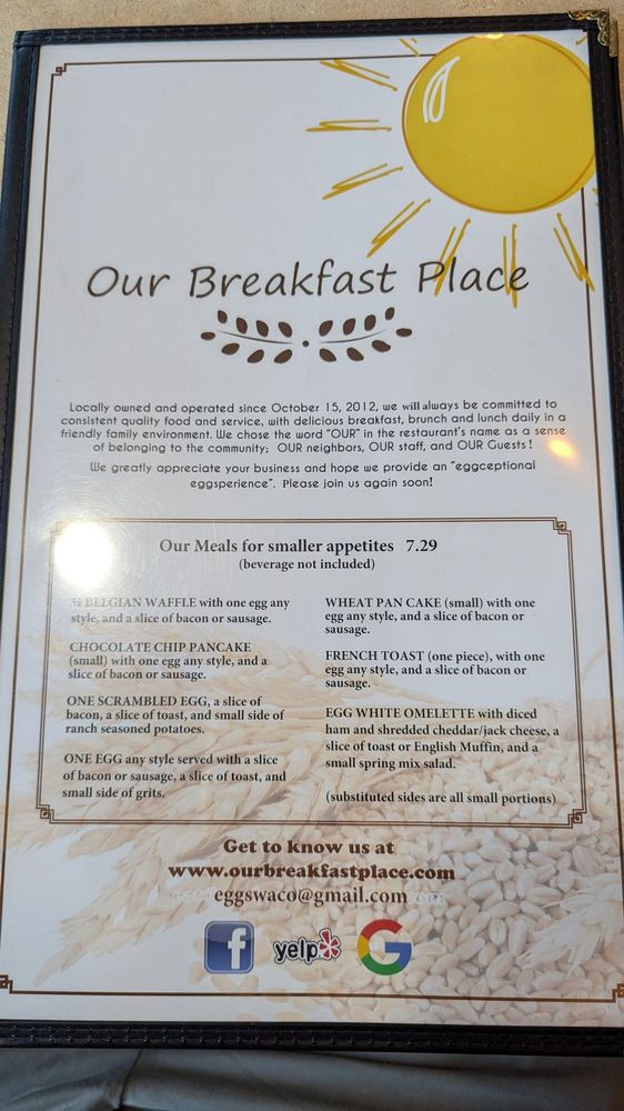 Welcome to Our Breakfast Place, a vibrant breakfast and brunch hub located at 4600 Franklin Ave, Waco, TX. This Latinx and women-owned establishment embraces a casual atmosphere, perfect for families and groups alike. The menu offers a delightful variety, from the Garden Frittata and Avocado Mash on Toast for health-conscious diners to indulgent HitchHiker Benedict and Oatmeal Pancake for those craving something sweet.